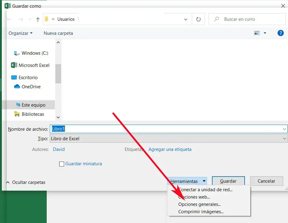 Une fois ici, nous sélectionnons l’option habituelle dans ces cas, Enregistrer sous , pour ensuite spécifier le chemin du disque où nous allons le sauvegarder. Après cela, la fenêtre habituelle apparaît où nous spécifions le nom du nouveau fichier, mais sous cette boîte de dialogue, nous voyons qu’une liste déroulante appelée Outils se trouve, où nous cliquons.