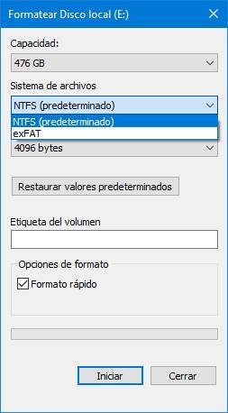 La première chose que nous allons faire est de formater la mémoire USB au format NTFS . Si nous utilisons un autre système de fichiers, tel que FAT32 ou exFAT, nous ne pourrons pas utiliser cette fonction. Donc, si nous n’avons pas encore le lecteur sur ce système, nous devons le formater pour continuer. Pour ce faire, il suffit de le connecter au PC, de cliquer avec le bouton droit de la souris sur l’appareil et de choisir de formater.