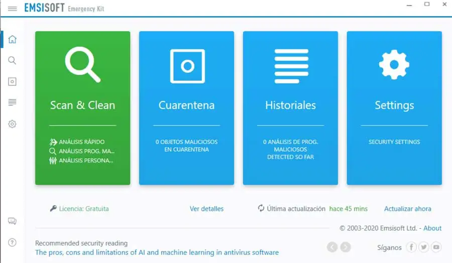 Disons que le programme de sécurité nous présente un aspect avec des améliorations visuelles où, tout d’abord, nous trouvons quatre raccourcis principaux. Cela fait référence à des sections importantes telles que l’analyse et le nettoyage du système , les éléments mis en quarantaine, l’historique de l’ analyse et les paramètres. Tout cela nous permettra de garder l’ordinateur exempt de tous types de logiciels malveillants et de codes malveillants d’une manière simple.