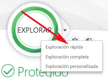 La première chose que nous y trouvons est peut-être l’une des fonctions que nous allons utiliser de manière plus courante. Ce n’est autre que le bouton Explorer, qui est situé au centre de la fenêtre, pour que nous puissions bien la voir. À son tour, à côté, nous trouvons une liste déroulante afin que nous puissions choisir le type d’ analyse que nous voulons effectuer: rapide, complet ou personnalisé.