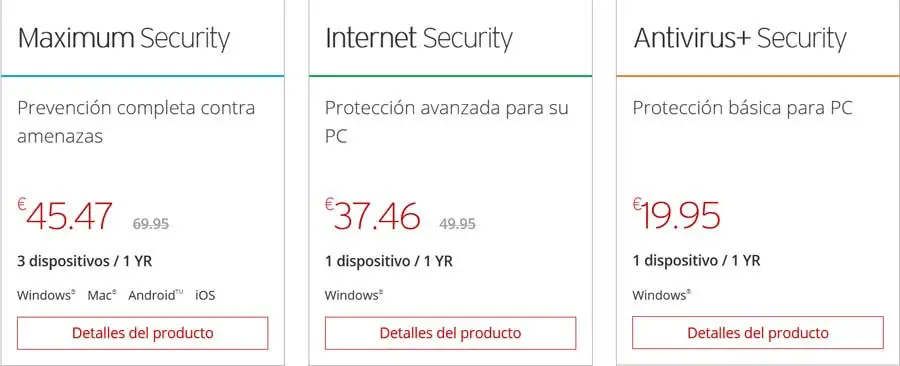 Comme nous l’avons mentionné au début, c’est une firme de sécurité qui propose plusieurs propositions à cet égard, toutes en fonction de nos besoins. De cette façon, nous trouvons en premier lieu le logiciel le plus basique qui est Antivirus + Security. Il s’agit d’une licence d’un an et d’une équipe que l’on peut obtenir pour 19,95 euros pour Windows.