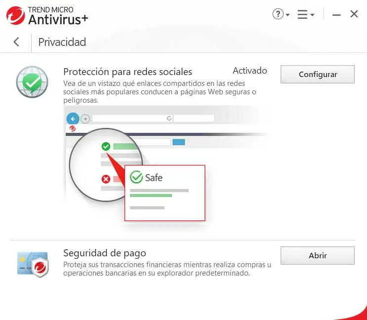 Et comme beaucoup d’entre vous le savent de première main, nous réalisons aujourd’hui toutes sortes de travaux et d’usages via Internet. Que ce soit dans les domaines professionnel, personnel ou de loisirs, Internet est devenu un élément clé de notre vie quotidienne. C’est pourquoi, en ce qui concerne notre confidentialité, l’antivirus de Trend Micro se concentre sur deux sections. Pour eux, nous pouvons activer, ou non, la protection en arrière-plan que nous offre ce logiciel. Ainsi, pour nous donner une idée, voici les domaines de l’importance des réseaux sociaux ou des achats en ligne.