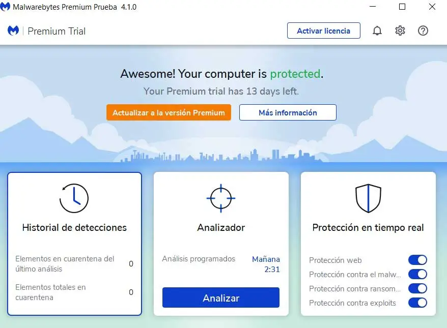 À ce stade, nous vous dirons qu’une fois que nous aurons téléchargé et installé le Malwarebytes Premium susmentionné sur le PC, nous trouverons une interface agréable.