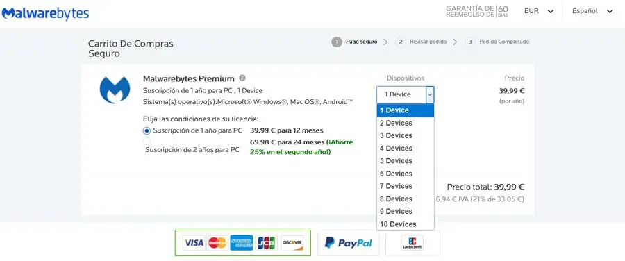 Bien sûr, une fois que le temps que nous avons mentionné est passé, l’ antivirus devient payant pour que nous puissions continuer à l’utiliser sans problème. Ensuite, nous devrons payer un prix de 39,99 euros pour un abonnement d’un an, ou 69,98 pour deux. C’est aussi un coût qui va augmenter car nous utilisons le même abonnement sur un plus grand nombre d’ordinateurs indépendants. Pour finir nous vous dirons que tout cela nous est disponible sur le site officiel de l’entreprise .