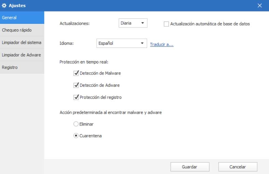Mais en même temps, nous devons garder à l’esprit que tous ces processus et analyses que le programme lui-même effectue peuvent être personnalisés. Nous faisons cela à partir de la section de configuration de celui-ci. De cette façon, à partir de la fenêtre qui apparaît pour tout cela, nous aurons la possibilité d’ajuster la protection en temps réel , que faire avec le malware détecté, gérer les mises à jour, ou quoi faire dans la vérification rapide.