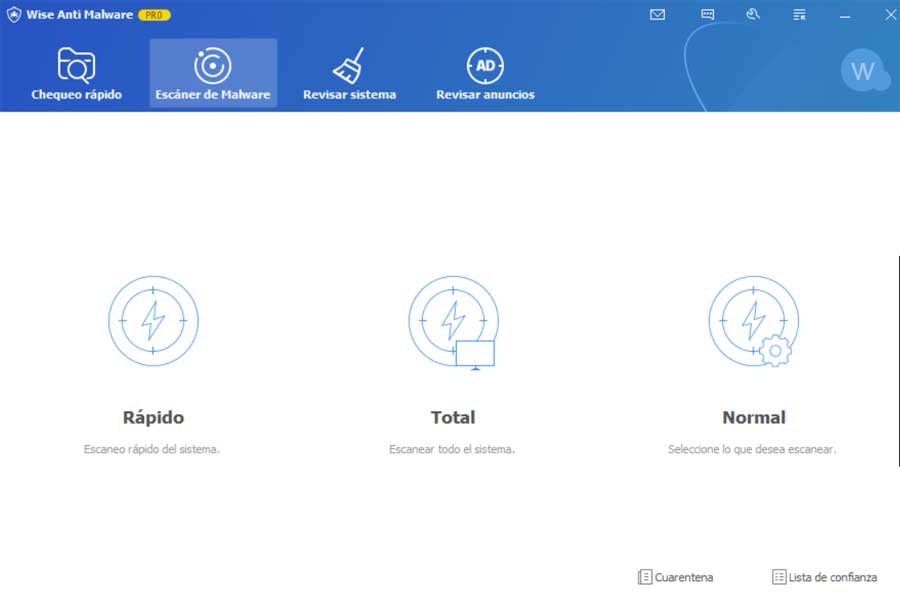 En fait, on accède à cette même section à partir du bouton en forme de clé situé en haut de l’interface principale du programme. Mais si nous voulons effectuer une analyse plus approfondie de l’ordinateur, nous vous recommandons de jeter un œil à l’onglet Malware Scanner . Dans celui-ci, ce que nous allons trouver, ce sont trois options d’analyse en fonction de l’heure et de la profondeur de la même chose. Évidemment, plus la méthode choisie est stricte, plus elle prendra du temps.