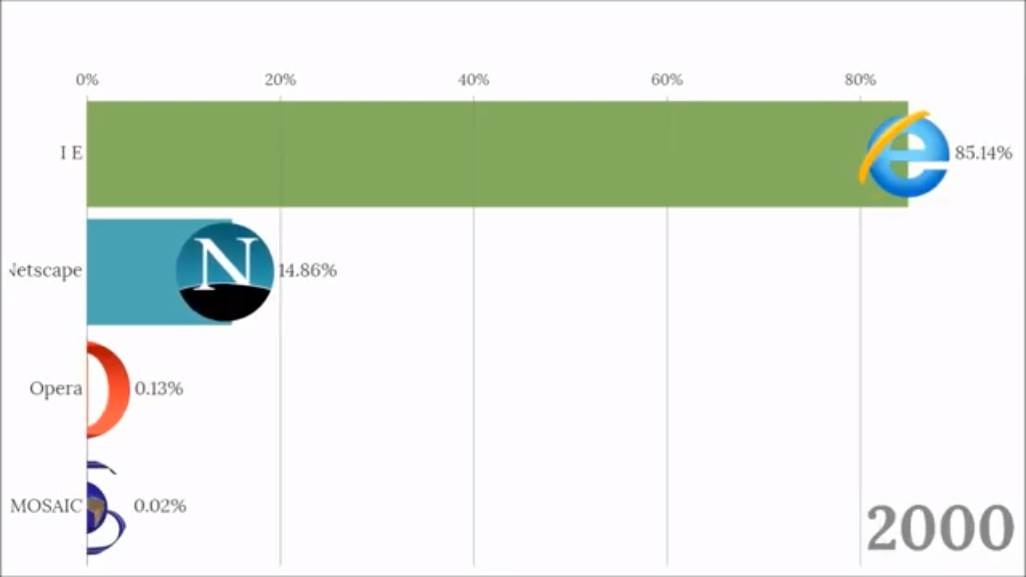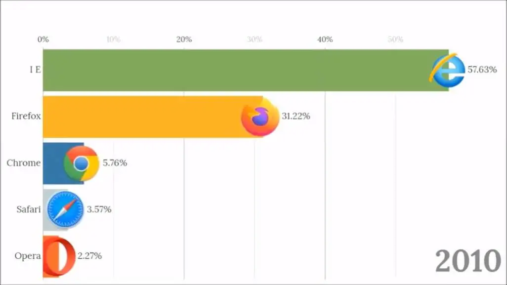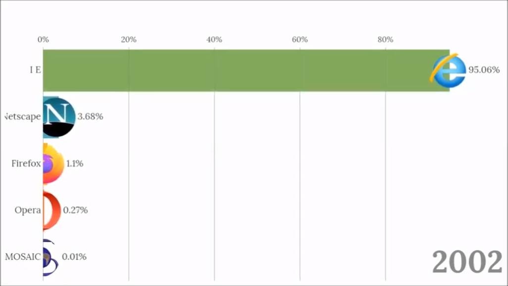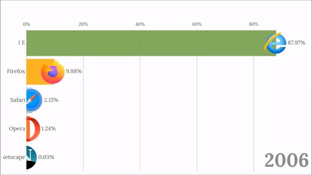 Les 3 années suivantes ont été plus ou moins équilibrées: Internet Explorer avec une part de marché de 96%. Firefox devient imparable, Safari gagne en prestige et Netscape disparaît enfin.