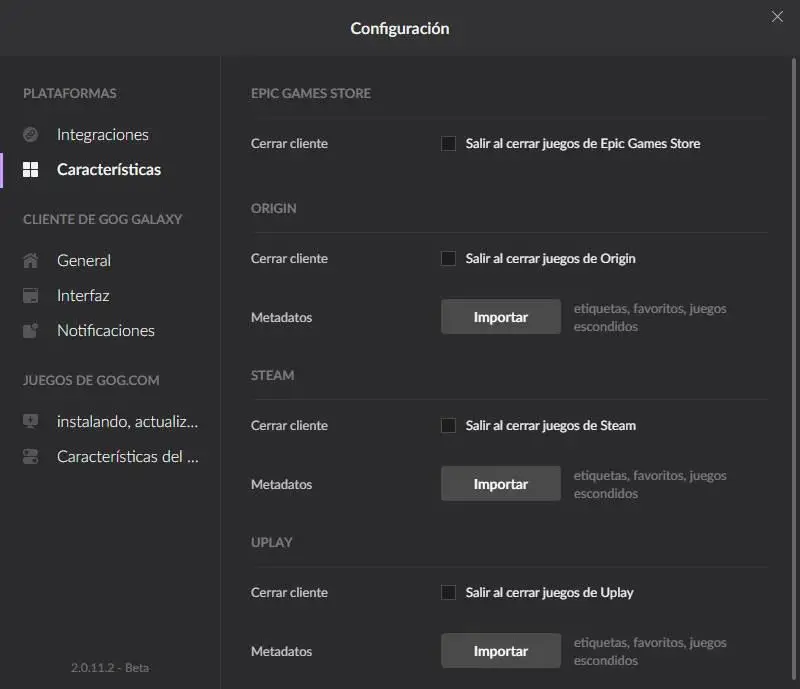 Avant de terminer, l’une des fonctions qui nous intéresse le plus liée à l’intégration d’autres plates-formes est l’importation de données. Dans l’onglet «Fonctionnalités», nous trouverons des options pour tous les clients. Nous pouvons, par exemple, importer des tags, des jeux préférés, des jeux cachés et plus d’informations depuis chacune des plateformes. Configurez même GOG pour fermer automatiquement les clients lorsque vous quittez chaque jeu.