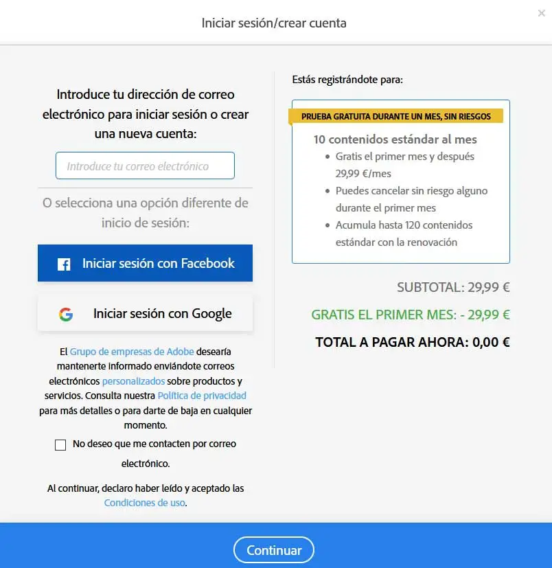 Comme nous venons de le mentionner, la firme Photoshop nous propose ici une multitude de contenus, dont beaucoup sont gratuits. Cependant, pour les télécharger et les utiliser, la première chose à faire est de vous inscrire sur la plateforme, puis de vous abonner à certains des plans qu’Adobe présente ici. En fonction de la modalité et du moment de l’abonnement, le paiement sera à partir de 29,99 euros par mois. Bien sûr, dans le cas où avant de commencer à payer pour le service, si nous voulons essayer tout ce que nous allons trouver ici auparavant, nous pouvons le tester gratuitement pendant un mois. Pour cela, il suffit que nous nous inscrivions dans Adobe Stock , par exemple avec un compte Google .