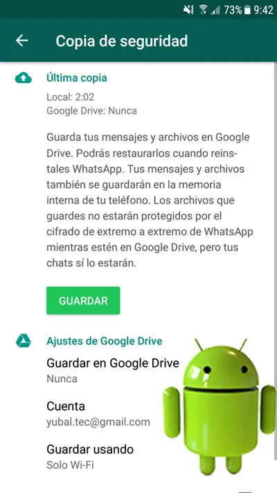 L’alternative la plus simple et la plus utilisée pour récupérer les messages que vous avez supprimés il y a peu de temps sur votre WhatsApp, consiste à utiliser la sauvegarde sur votre mobile Android . Pour cela, il faut le configurer dans l’application et le garder là-bas, de telle sorte que si ce type de situation se présente, vous ayez déjà la prévoyance et vous savez que vous pouvez le récupérer sans complications.
