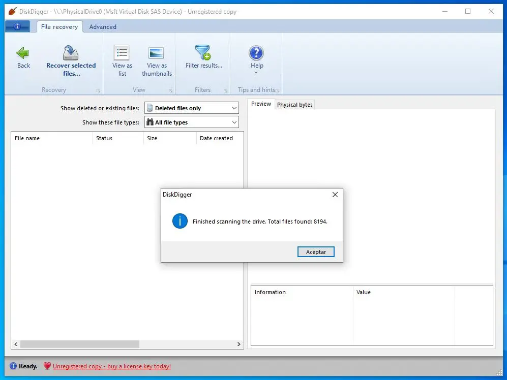 DiskDigger est compatible avec toutes les versions de Windows, de l’ancien XP au plus moderne Windows 10 Build 2004 et est disponible gratuitement sur le site officiel du développeur, bien que chaque petit instant nous demande d’entrer la clé que nous avons achetée (vaut environ 13 euros) et l’interface n’est disponible qu’en anglais.