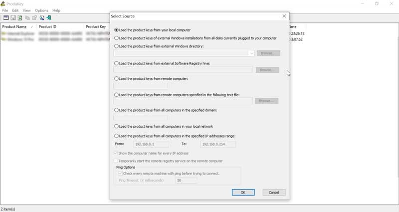 En haut, nous trouvons la barre d’outils classique organisée par onglet. Dans l’option «Fichier», si nous cliquons sur «Sélectionner la source», nous pouvons configurer une multitude de sources que l’application prend en charge pour lire les clés de produit. De cette manière, le logiciel peut charger des informations depuis notre ordinateur localement, depuis un annuaire Windows externe, depuis le Registre d’un logiciel externe, depuis un ordinateur distant, depuis tous les ordinateurs connectés à un domaine spécifique, depuis tous les ordinateurs sur un réseau local ou de tous les ordinateurs dans une plage d’adresses IP spécifiée.