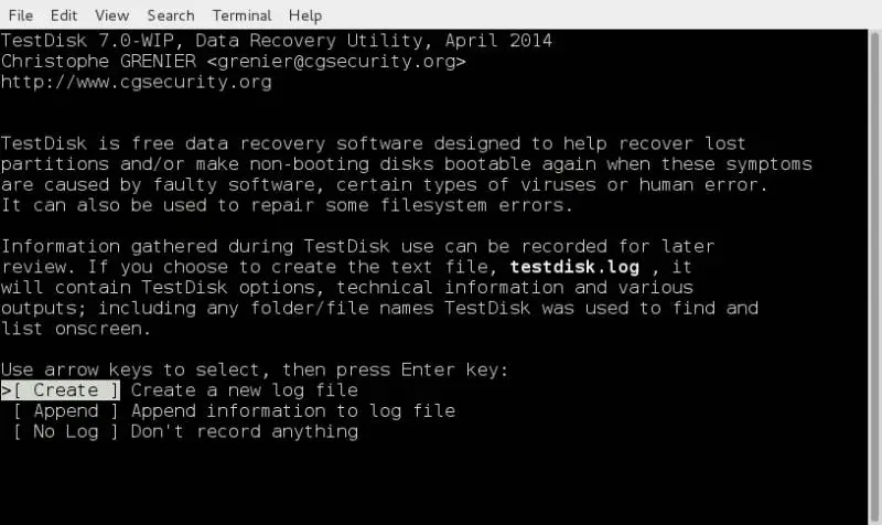 Le fait que ce programme ne possède pas d’interface graphique peut remettre en cause certains utilisateurs. Cependant, il s’agit en fait d’un logiciel très simple à utiliser. Une fois téléchargé, nous ouvrons TestDisk dans notre système d’exploitation et nous pouvons voir l’écran principal du programme, où nous devrons choisir si nous voulons créer un nouveau journal du travail que nous allons faire, ouvrir un journal existant ou simplement continuer sans journal. Nous vous recommandons d’utiliser l’option «Créer».