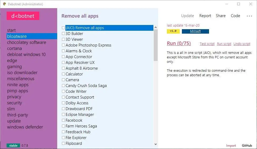 Bloatware: permet de sélectionner tous les bloatware qui sont installés dans Windows 10 pour supprimer toutes ces applications en un seul clic.