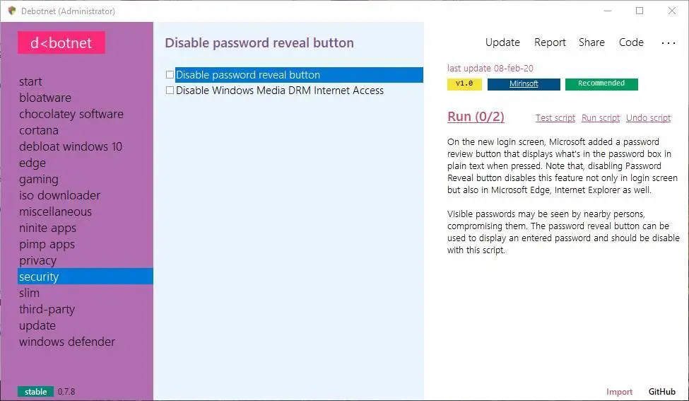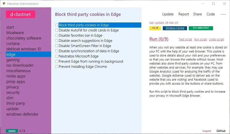 Comme on peut le voir, l’interface du programme n’a aucune difficulté. À l’extrême gauche, nous trouverons les principales options du programme. Dans la partie centrale, nous pouvons voir une liste avec tous les scripts que nous pouvons trouver. Chacun d’eux applique une série de modifications au système pour nous permettre d’améliorer notre confidentialité. Et sur la droite, nous pouvons voir s’il s’agit d’un script recommandé (modifications que nous pouvons appliquer sans problème) et une description de ce qu’il fait.
