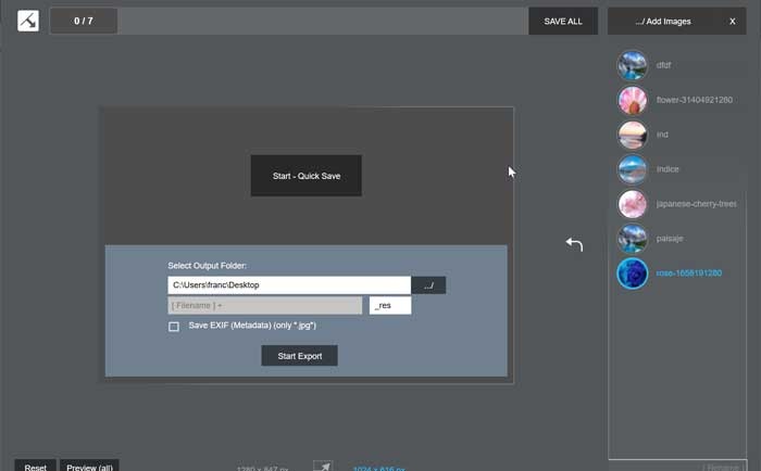 Una vez que hayamos realizados todos los ajustes que deseamos, bastará con hacer clic en el botón de Save All, seleccionar la ubicación donde van a ser exportadas las imágenes y pulsar en Start Export para aplicar los cambios y guardar las imágenes que hemos editado.