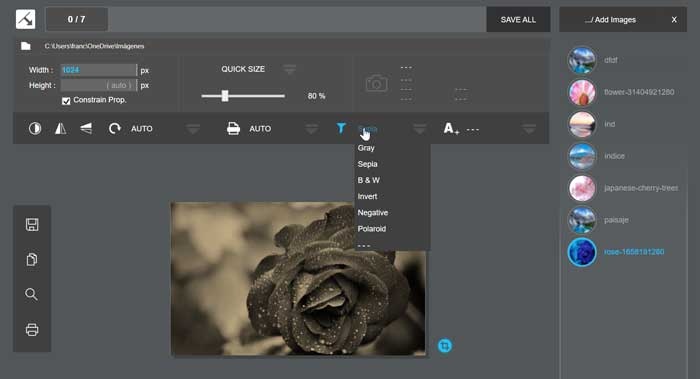 También tenemos la opción de agregar filtros grises, sepia, negativo, polaroid, o cambiar el formato a la imagen. Además, es posible configurar todos los cambios necesarios antes de agregar imágenes y la aplicación se encargará de aplicarlos de manera automática.