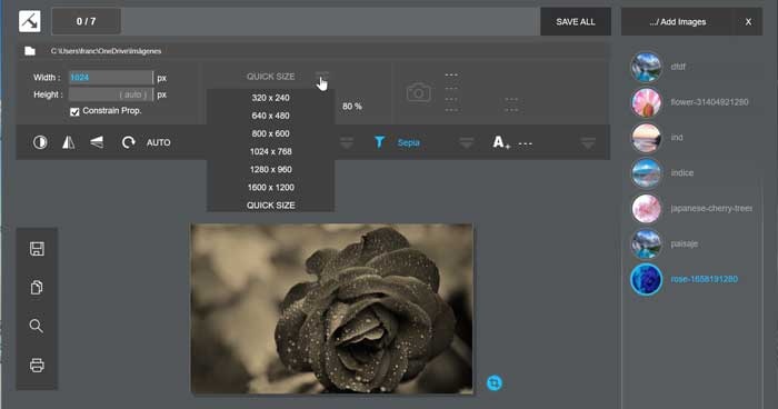 En la parte superior izquierda tenemos la posibilidad de cambiar el tamaño de forma rápida, pudiendo seleccionar nosotros mismos las proporciones o bien escoger algunas de las que vienen predeterminadas. La función de vista previa no cambiará el tamaño, pero sí podremos ver en todo momento las proporciones de alto y ancho en la parte inferior.