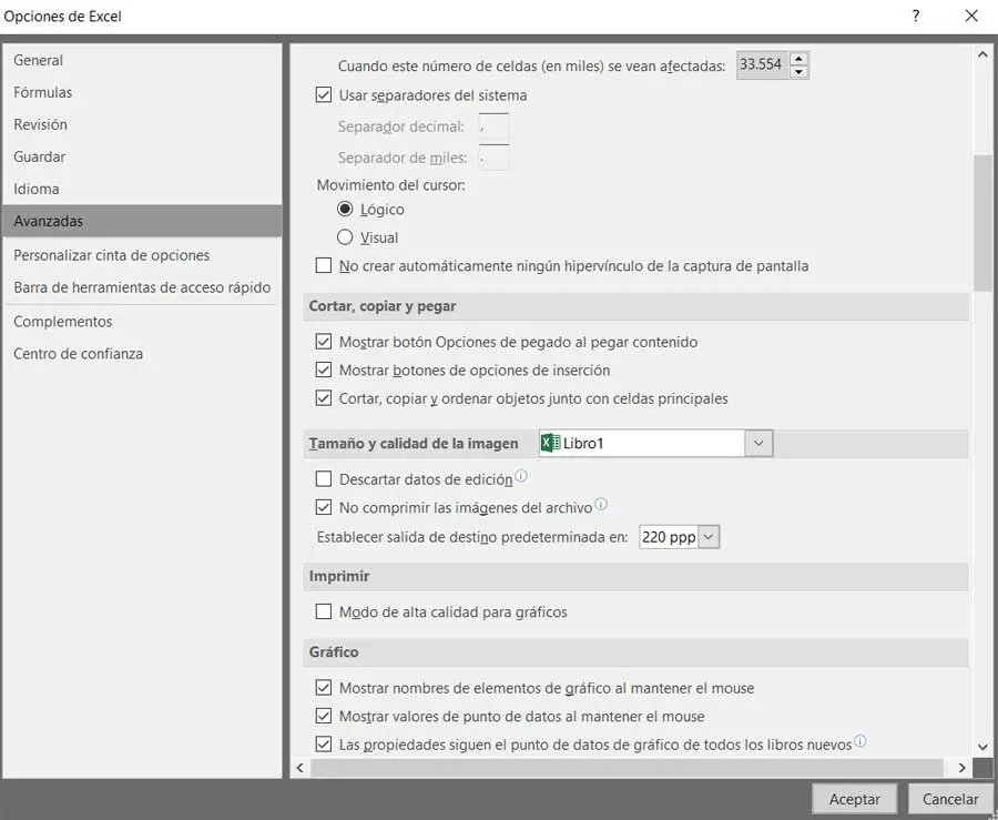 Puis une nouvelle fenêtre s’ouvrira avec une multitude de fonctions personnalisables qui nous permettront d’ajuster le comportement général d’Excel. Eh bien, dans le cas présent, dans le panneau de gauche, nous devons localiser l’entrée appelée Advanced. Ensuite, dans le panneau de droite, nous faisons défiler jusqu’à ce que nous trouvions la section Taille et qualité de l’image . Comme vous pouvez l’imaginer, nous allons ici personnaliser par défaut ce point dont nous parlons maintenant.