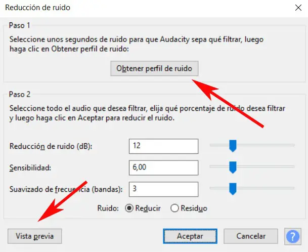 Dans celui-ci, nous cliquons sur le bouton appelé «Obtenir le profil de bruit», donc la fenêtre se fermera. C’est normal, alors nous retournons au même menu «Effets / Réduction du bruit» pour ouvrir à nouveau la même fenêtre. Une fois que le programme a généré ce profil de bruit en interne, nous pouvons maintenant choisir d’utiliser les paramètres par défaut qui apparaissent dans cette fenêtre, recommandés pour les utilisateurs inexpérimentés dans ces domaines.