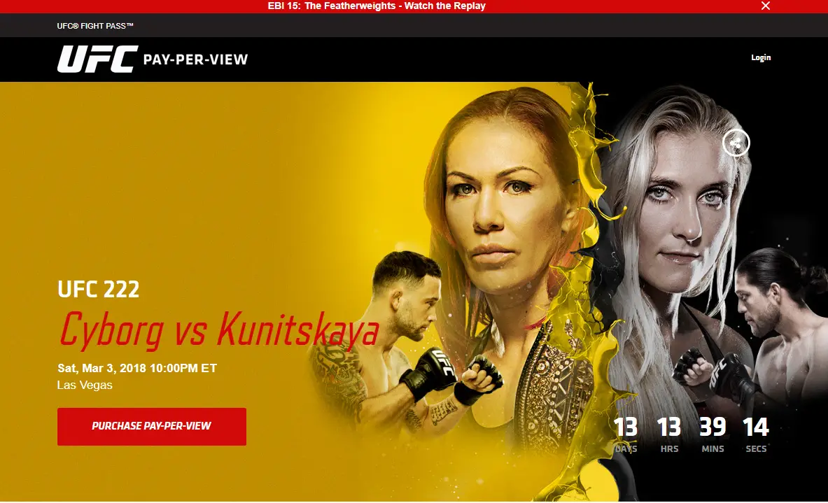 Pour afficher plus d’informations sur un abonnement à la carte et en acheter un pour l’événement Cyborg vs Kunitskaya, accédez à https://www.ufc.tv/video/ufc-222 et cliquez sur Acheter à la carte .