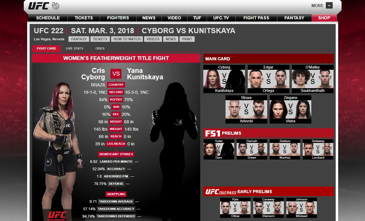 Qui se tiendra à Las Vegas le samedi , 3 rd Mars 2018, UFC 222 sera le premier UFC russe Kunitskaya – et il sera difficile! Elle affronte le légendaire Cyborg, qui a fait sensation à la fin de l’année dernière avec sa victoire en cinq tours contre Holly Holm. Si vous voulez voir toute l’action en ligne, cet article est pour vous: aujourd’hui, nous vous montrons comment regarder UFC 222: Cyborg vs Kunitskaya en ligne.