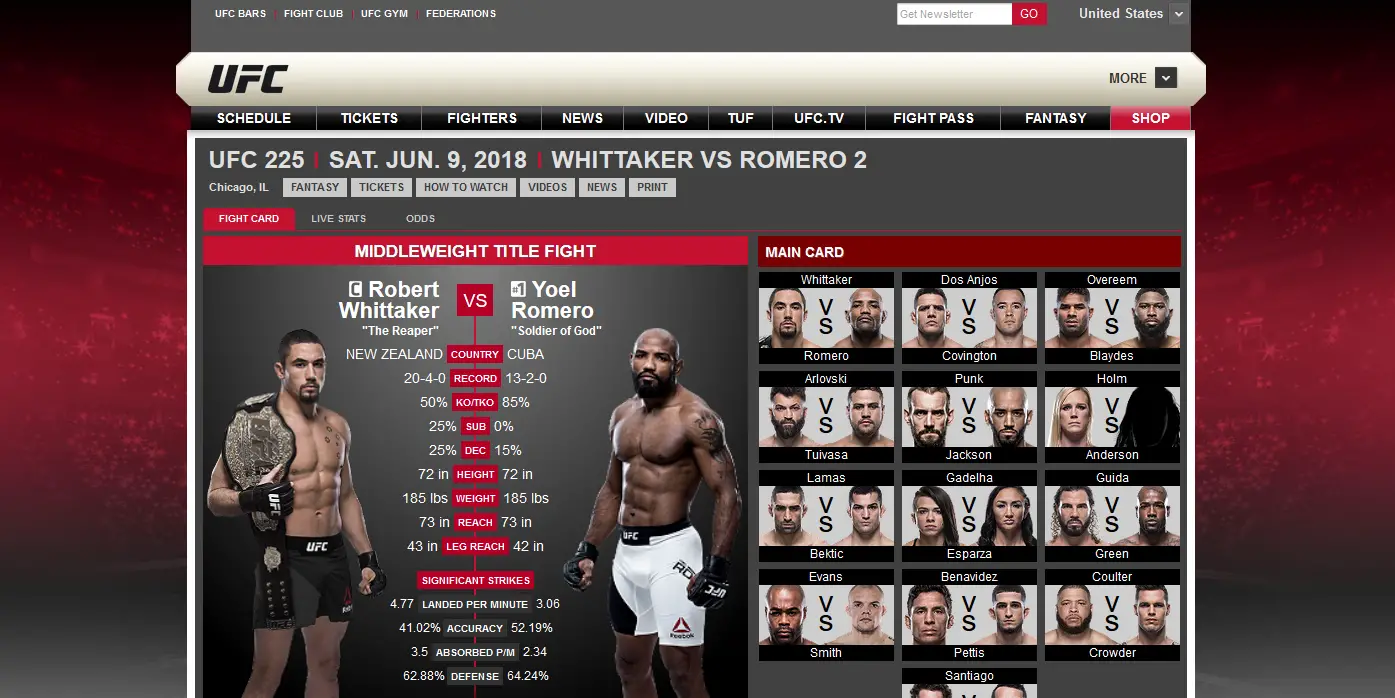 Le prochain match de l’ UFC 225 s’annonce important: le Néo-Zélandais Robert Whittaker affrontera le Cubain Yoel Romero dans la lutte pour le titre des poids moyens. Whittaker, alias «The Reaper», a un bilan impressionnant de 20-4-0, tandis que «Soldier of God» Romero est à 13-2-0. Les deux concurrents sont regroupés uniformément en termes de taille, de poids et de portée, de sorte que ce match revanche sera basé sur la psychologie et les compétences plutôt que sur la présence physique.
