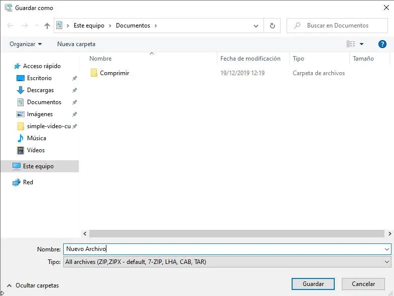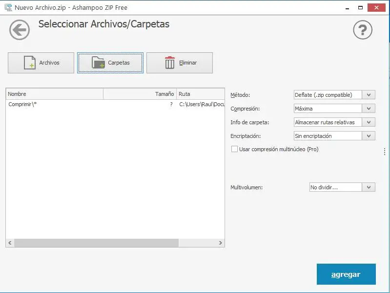 Après l’avoir sauvegardé, il lancera une autre fenêtre dans laquelle nous pourrons ajouter des fichiers ou des dossiers dans la tablette que nous avons créée. Il nous permet également d’indiquer la compression du dossier ou de le crypter, en plus d’indiquer la méthode de format compatible.