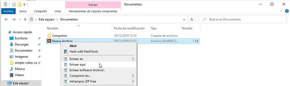 Menu contextuel des fichiers: un moyen simple d’extraire des fichiers, ou de les compresser, consiste à utiliser les options que le programme intègre dans le menu lorsque nous cliquons avec le bouton droit de la souris. Cette option est la même ou similaire à celle que nous aurions avec WinRAR ou d’autres programmes du même style.