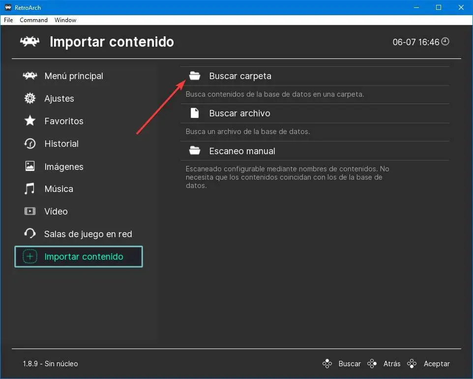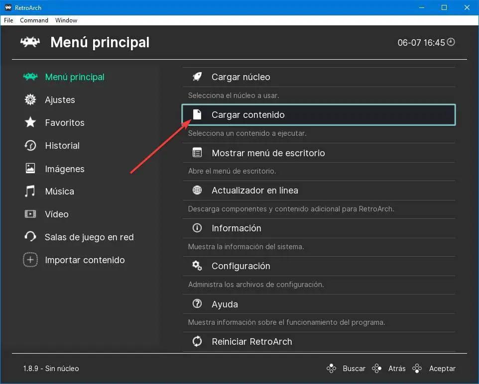 Il existe deux façons de charger des jeux dans RetroArch. Le premier provient du menu principal. Nous pouvons utiliser l’option de chargement de contenu pour charger n’importe quelle rom que nous avons sur l’ordinateur et ainsi pouvoir commencer à la lire directement, sans complications.