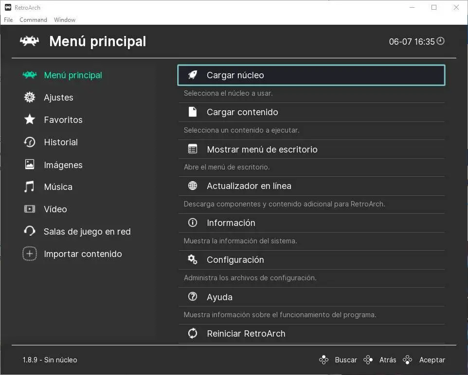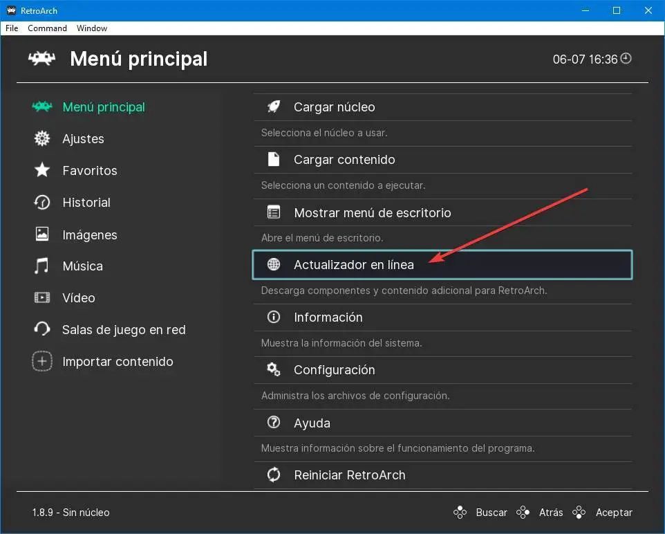 La première chose dont nous allons parler est le programme de mise à jour en ligne. Ce composant est celui qui nous permettra de télécharger toutes sortes de contenus pour cet émulateur. Par exemple, à partir de là, nous pourrons télécharger les cœurs que nous voulons utiliser, ainsi que des vignettes et toutes sortes de contenus.
