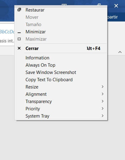 De cette façon, pour accéder au menu SmartSystemMenu, il suffit de cliquer avec le bouton droit de la souris sur la barre des tâches d’une fenêtre d’application que nous avons ouverte. Ici, un total de neuf options apparaîtront qui n’étaient pas auparavant. Parmi ceux-ci, nous en trouvons un pour prendre une capture d’écran de la fenêtre, copier le texte dans le presse-papiers, redimensionner, aligner ou faire une transparence , entre autres. Alors que la première nous montre les détails de la fenêtre courante, la seconde la rend visible à tout moment, ce qui peut être très utile dans certains cas.