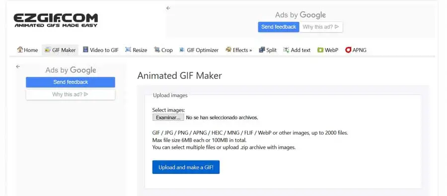 Nous allons d’abord parler de la proposition appelée Ezgif à laquelle vous pouvez accéder depuis votre navigateur Internet à partir de ce lien . Nous trouvons ici une application Web dans laquelle la première chose que nous devrons faire est de télécharger les photos que nous voulons faire partie du GIF transparent. De plus, peu importe qu’ils aient des tailles différentes, tant qu’ils n’ont pas de fond. En effet, l’application en ligne elle-même nous permet de redimensionner ces éléments d’entrée avant de créer le GIF transparent.