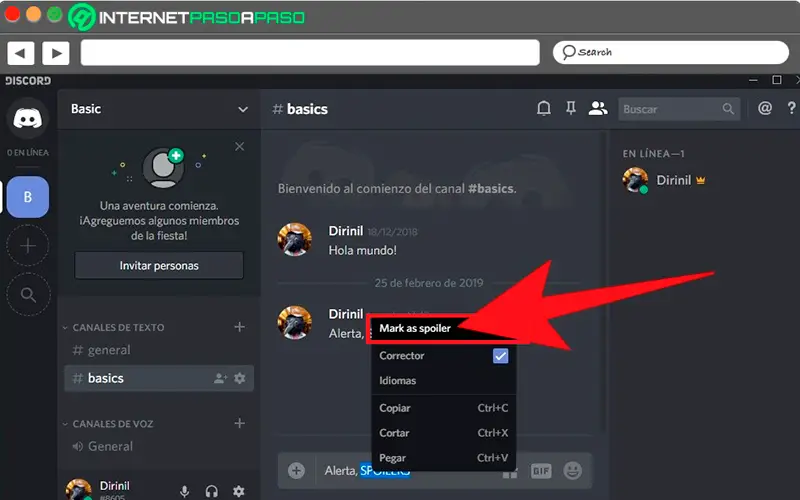 - Après avoir sélectionné le texte que vous souhaitez masquer, vous devez faire un clic droit dessus . Là, vous verrez un menu déroulant où vous trouverez différentes options, dans ce cas, vous devez sélectionner «Marquer comme spoiler» qui apparaît généralement en premier dans la liste.