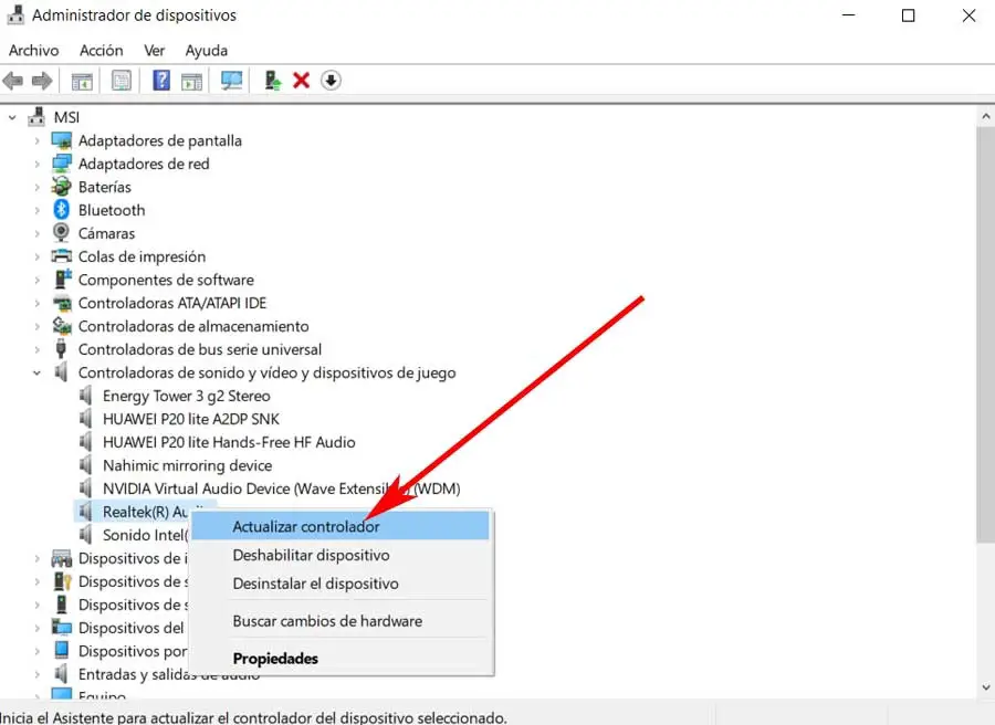 Ainsi, nous allons voir la section sur les contrôleurs audio et vidéo , une liste que nous affichons pour voir l’entrée sonore. Dans de nombreux cas, il peut s’agir de Realtek , nous cliquons donc avec le bouton droit de la souris.
