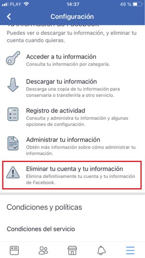- Dans cette section, il existe de nombreuses options, mais vous devez les parcourir toutes jusqu’à ce que vous en trouviez une appelée «Supprimer votre compte et vos informations» . C’est le dernier qui apparaît avant d’atteindre la section des conditions et politiques du réseau social. Lorsque vous le trouvez, vous devez cliquer dessus.