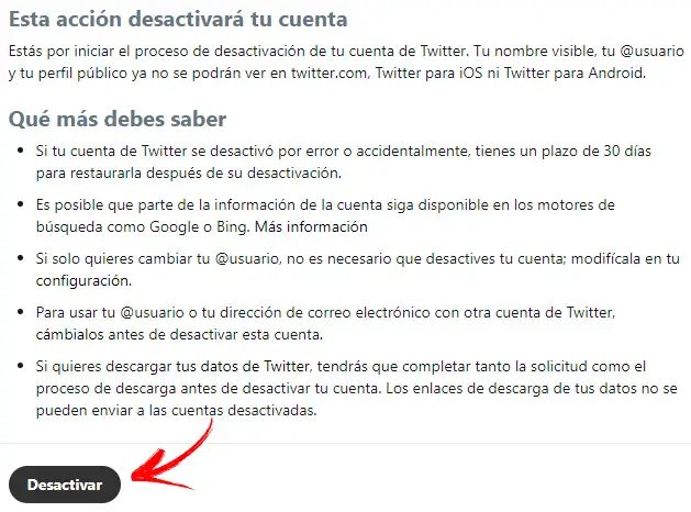 Sur l’écran suivant qui apparaît, Twitter vous informe de ce qu’implique la fermeture du profil et de l’existence d’un délai raisonnable pour le récupérer et utiliser à nouveau le réseau social. Gardez cela à l’esprit, car c’est la clé de tout cela. Cependant, continuez en cliquant sur le bouton avec le texte «Désactiver».