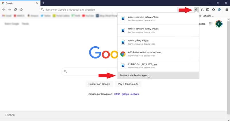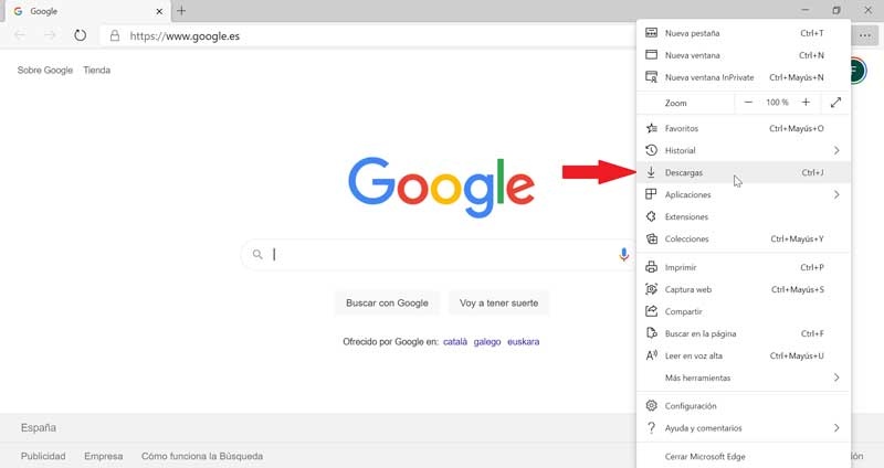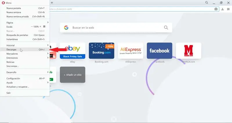 Pour cela, nous devons entrer dans le navigateur et cliquer sur l’onglet «Menu», que nous trouvons en haut à gauche . Ensuite, un menu déroulant s’ouvrira où nous devons sélectionner l’option «Téléchargements», de sorte qu’un nouvel onglet s’ouvrira avec tous les téléchargements que nous avons effectués à partir du navigateur.