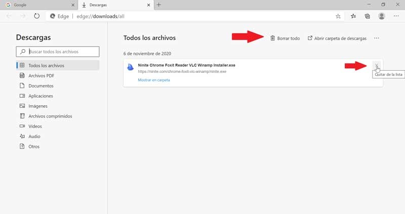 Le navigateur de Microsoft nous donne également la possibilité d’améliorer notre confidentialité en éliminant tous les téléchargements que nous avons effectués à partir du navigateur Edge.