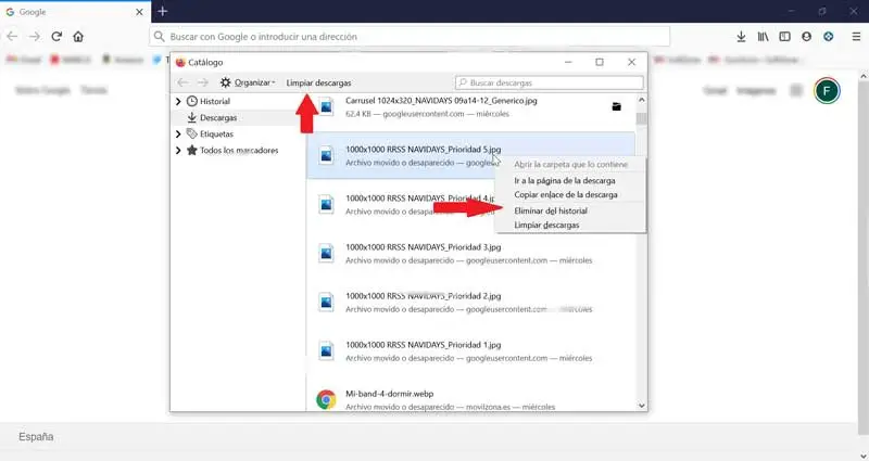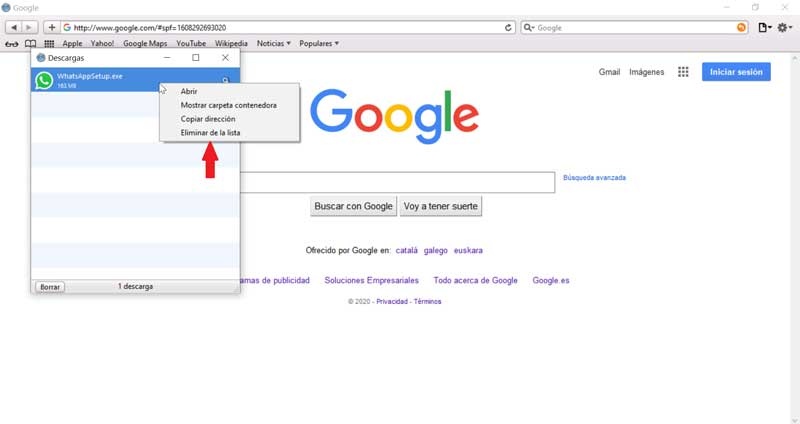 Pour supprimer un téléchargement individuellement, cliquez simplement dessus avec le bouton droit et appuyez sur l’option «Supprimer». Si nous voulons supprimer tous les téléchargements en même temps, nous effectuons la même opération, mais cette fois nous sélectionnons l’option «Supprimer tous les téléchargements terminés».