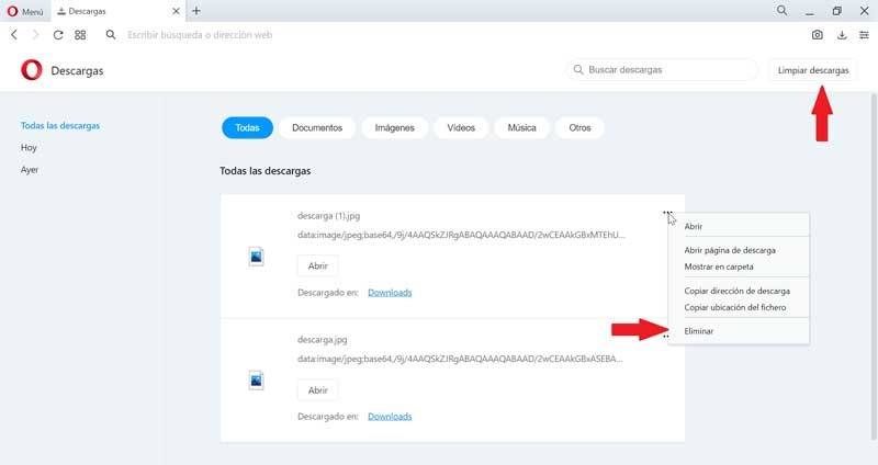 Le navigateur Opera populaire a parmi ses options la possibilité d’éliminer tout téléchargement que nous effectuons, soit individuellement, soit en supprimant tout en un seul clic.