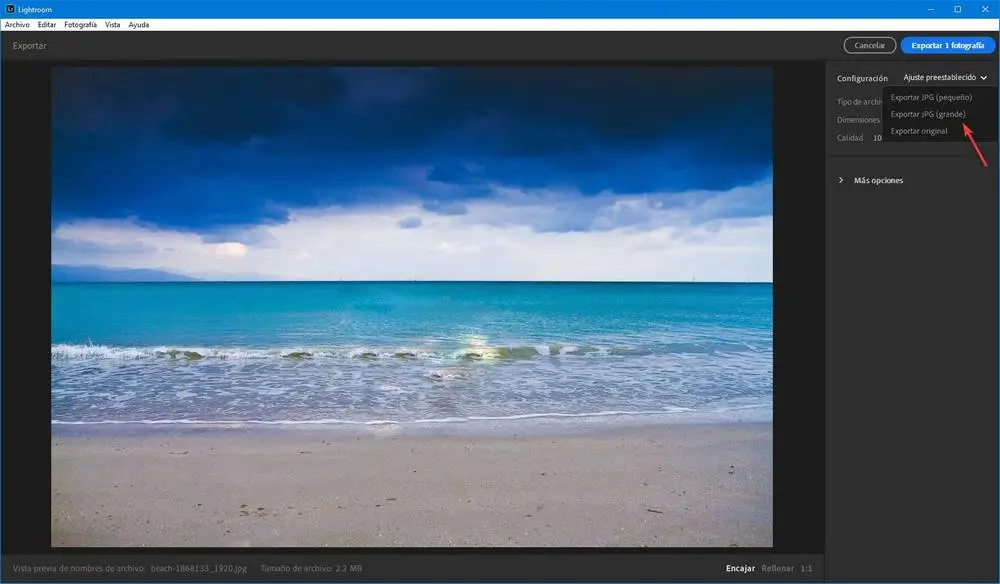 Une série d’options apparaîtra que nous pouvons configurer en fonction de la qualité dans laquelle nous voulons exporter la photo. Lightroom nous propose des paramètres prédéfinis pour choisir facilement la taille et la qualité de la photo. Nous vous recommandons d’utiliser la fonction pour exporter la photo en grand JPEG en qualité 100% afin qu’il n’y ait pas trop de perte.