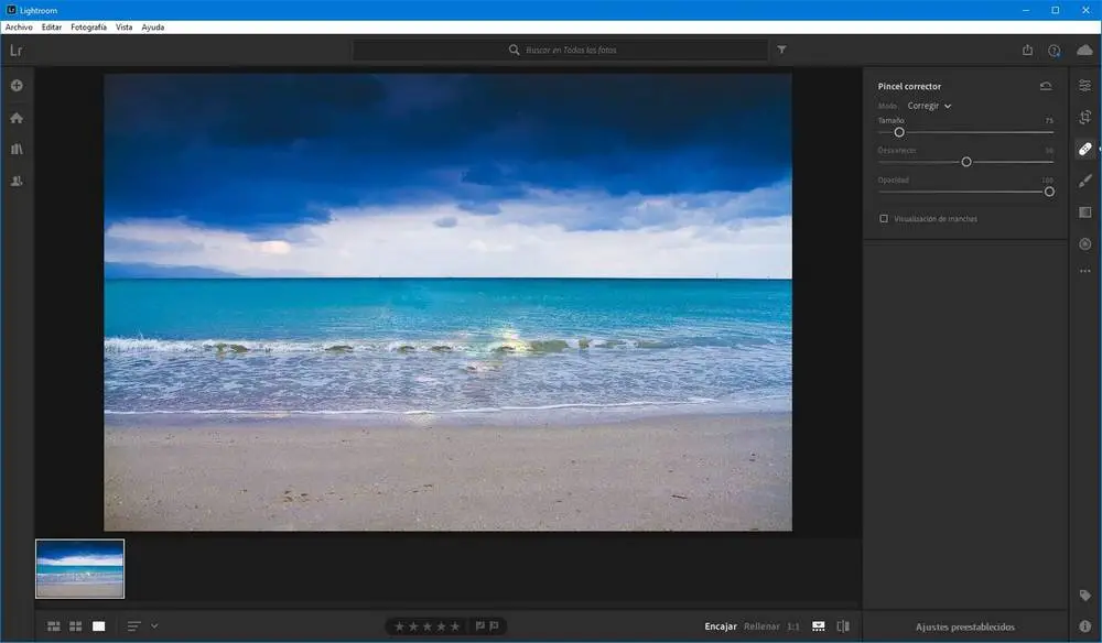 L’un des outils les plus intéressants que l’on puisse trouver dans ce logiciel est le pinceau de correction . Cet outil nous permet de sélectionner n’importe quelle partie de la photo et, en utilisant l’Intelligence Artificielle et une partie du contenu que nous devons sélectionner, il nous permettra d’éliminer ledit contenu sans en laisser de trace.