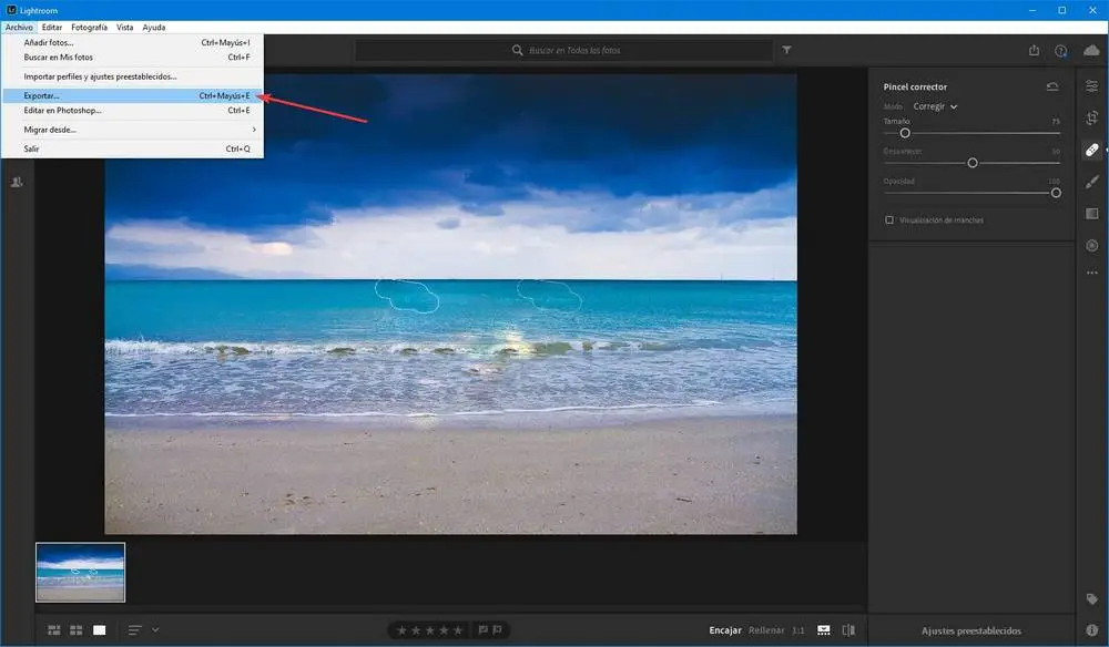Le menu pour exporter la photo se trouve dans la section «Fichier» de la fenêtre principale de Lightroom. Nous pouvons également l’exécuter avec le raccourci clavier Ctrl + Maj + E.
