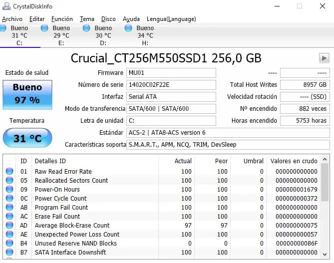 Ensuite, nous trouvons un programme gratuit que vous pouvez télécharger à partir de ce lien . Comme le cas précédent, il s’agit d’une application portable, elle ne nécessite donc aucune installation sous Windows . Sa fonction principale est de nous montrer de manière visible toutes les informations relatives aux unités de disques connectées au PC. Ici, comme prévu, les données SMART dont nous avons parlé sont incluses.
