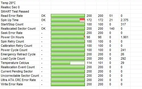 Parmi les données qui pourraient être montrées ici, nous trouvons la durée de vie dont il dispose ou s’il est dans un état optimal pour pouvoir continuer à travailler avec lui. De la même manière, nous verrons d’autres informations telles que la vitesse des plats de disque, les secteurs défectueux, le contrôle de redondance cyclique ou CRC , la température du disque, etc.