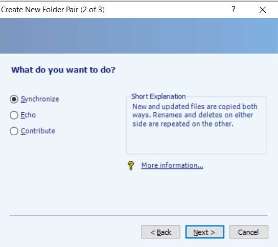 Ensuite, nous trouvons trois options de synchronisation: Syncronize, Echo et Contribute. Lors de la sélection de chacune de ces options, nous verrons également une description de leur fonctionnement. Dites que le premier mode synchronisera tous les fichiers et dossiers, donc si nous supprimons quelque chose de l’un des deux, il sera également supprimé de l’autre. D’autre part, Echo copie tous les nouveaux fichiers et les fichiers mis à jour du dossier de gauche vers la droite. Si nous supprimons ou modifions le nom d’un fichier à gauche, le nom à droite sera également supprimé ou modifié.