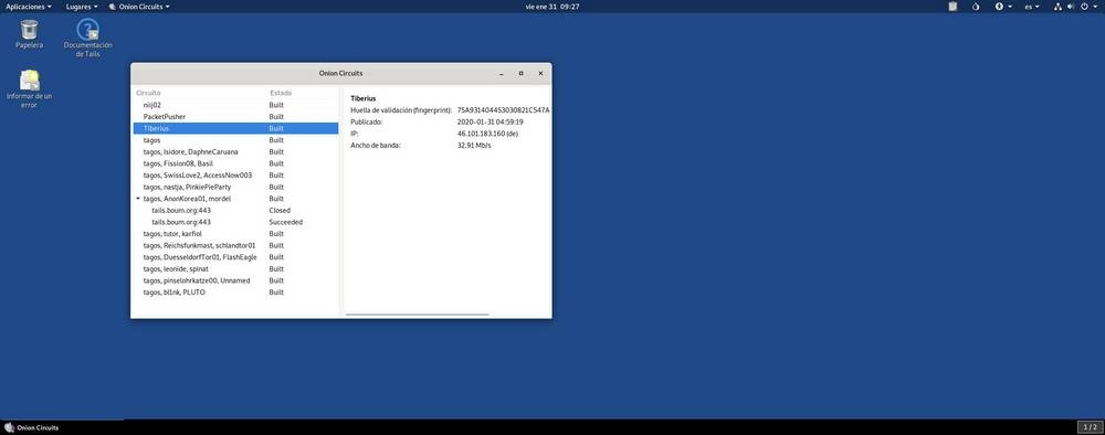 Pour protéger l’anonymat des utilisateurs, cette distribution est livrée avec une instance Tor entière installée par défaut. Cela nous permettra que, dès le démarrage de la distribution, tout le trafic quitte notre ordinateur crypté et acheminé via ce réseau distribué. Pour naviguer sur Internet, Tails est livré par défaut avec la dernière version de Tor Browser , le navigateur officiel de Tor, basé sur Firefox, qui est configuré pour une sécurité et une confidentialité maximales. En outre, il est livré avec des extensions intéressantes telles que Torbutton, HTTPS Everywhere et NoScript, entre autres.