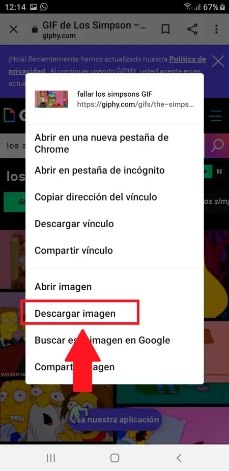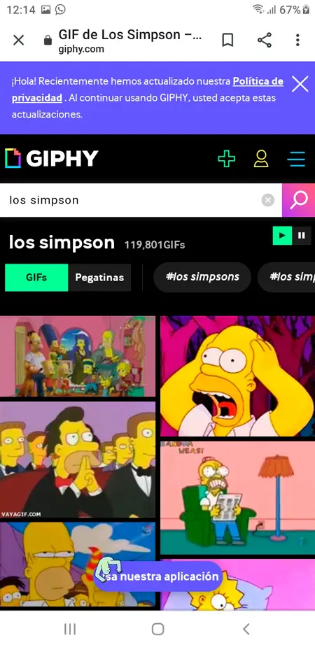 - Une fois que vous avez écrit le sujet du Gif que vous recherchez , tous les éléments liés apparaîtront sur les écrans, dans ce cas «Les Simpsons» a été écrit .