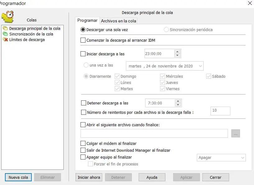 En plus de tout cela que nous commentons, nous ajoutons bien sûr la possibilité de gérer plusieurs téléchargements simultanés , d’en interrompre certains, ou d’éliminer leur contenu. De la même manière, et à partir du bouton Planifier, nous avons la possibilité de charger les sources des fichiers à télécharger, et de spécifier au programme quand on souhaite vraiment les télécharger. Avec cela, nous réalisons que cette bande passante est utilisée lorsque nous n’en avons pas besoin pour d’autres tâches, par exemple.